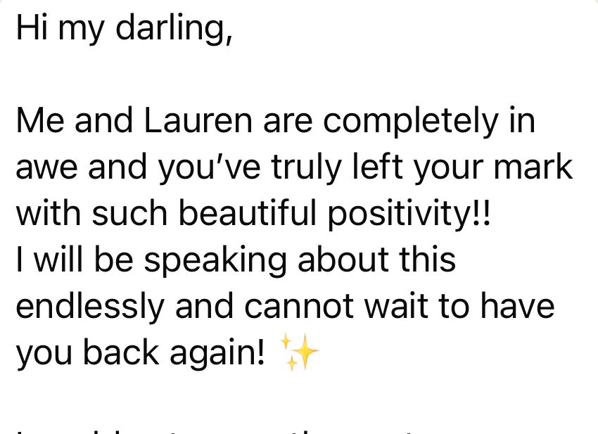 " I walked out of Holly’s event feeling lit up and inspired, and three months later the soulmate I manifested actually arrived. Her sessions are pure magic. "