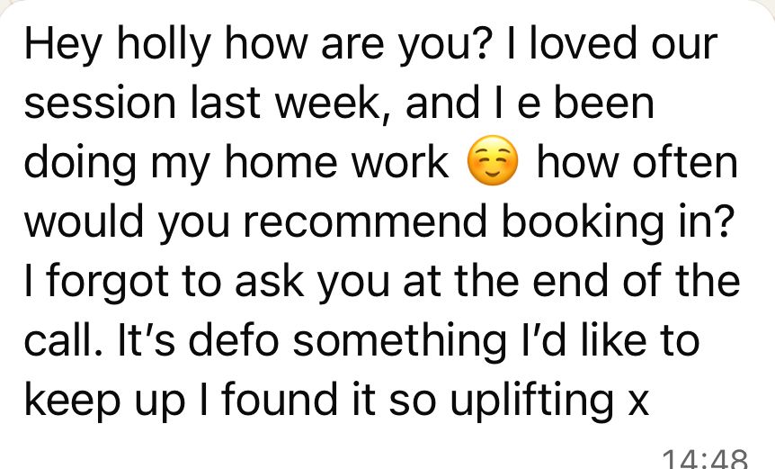 Holly’s coaching and manifesting guidance are designed to inspire, empower, and support your personal growth. She is not a medical or mental health professional, and her sessions are not a replacement for therapy, counselling, or medical treatment. Please seek appropriate professional care if you need support in those areas.